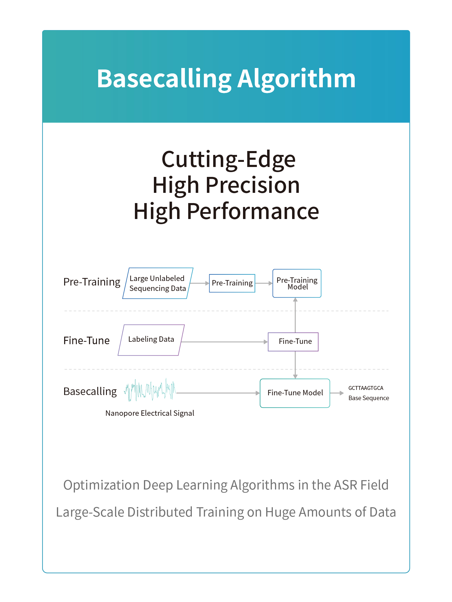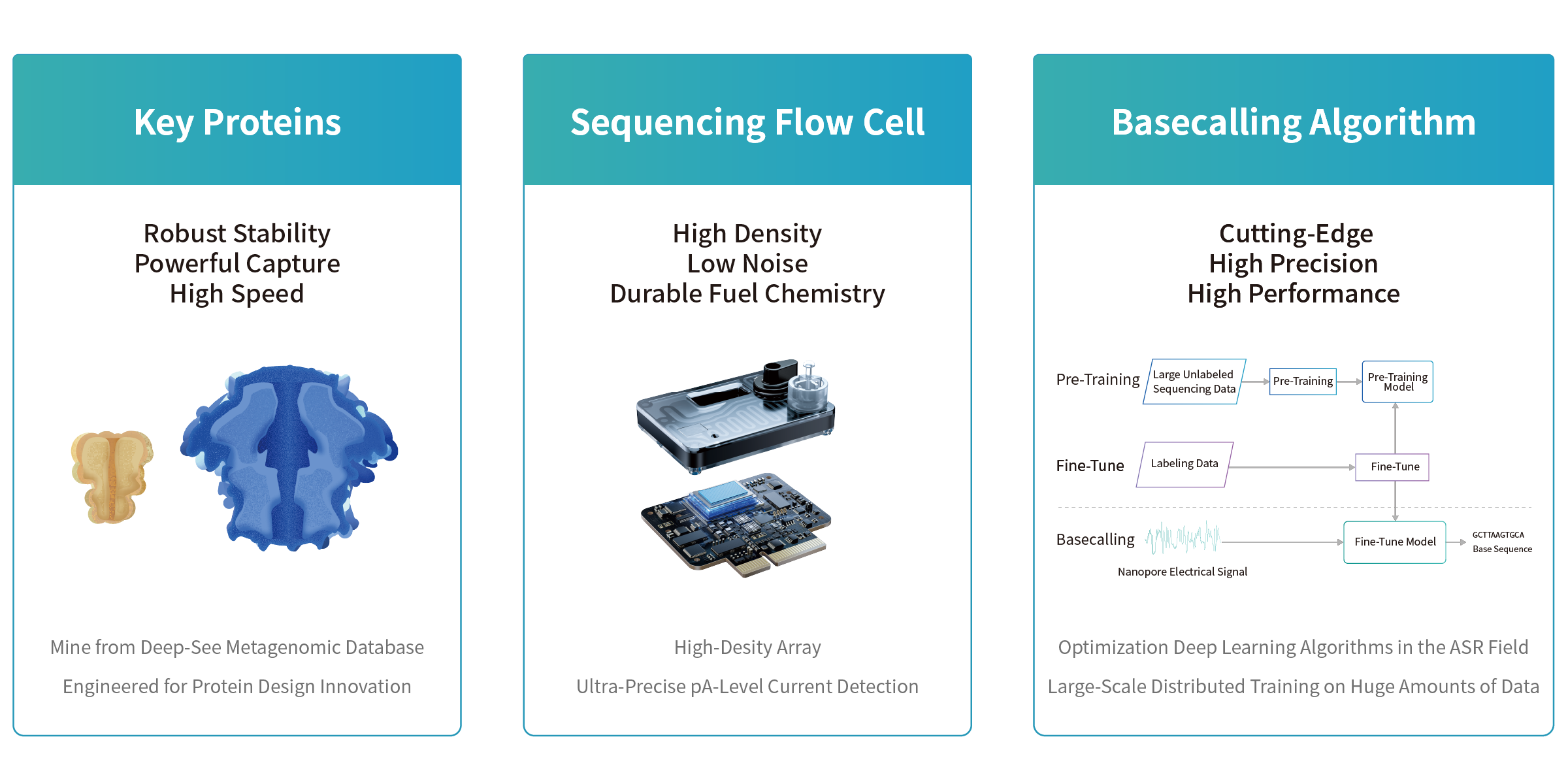 Software & AlgorithmThe software controls the sequencing reactions, while the algorithm model converts raw electrical signals into base sequence information.